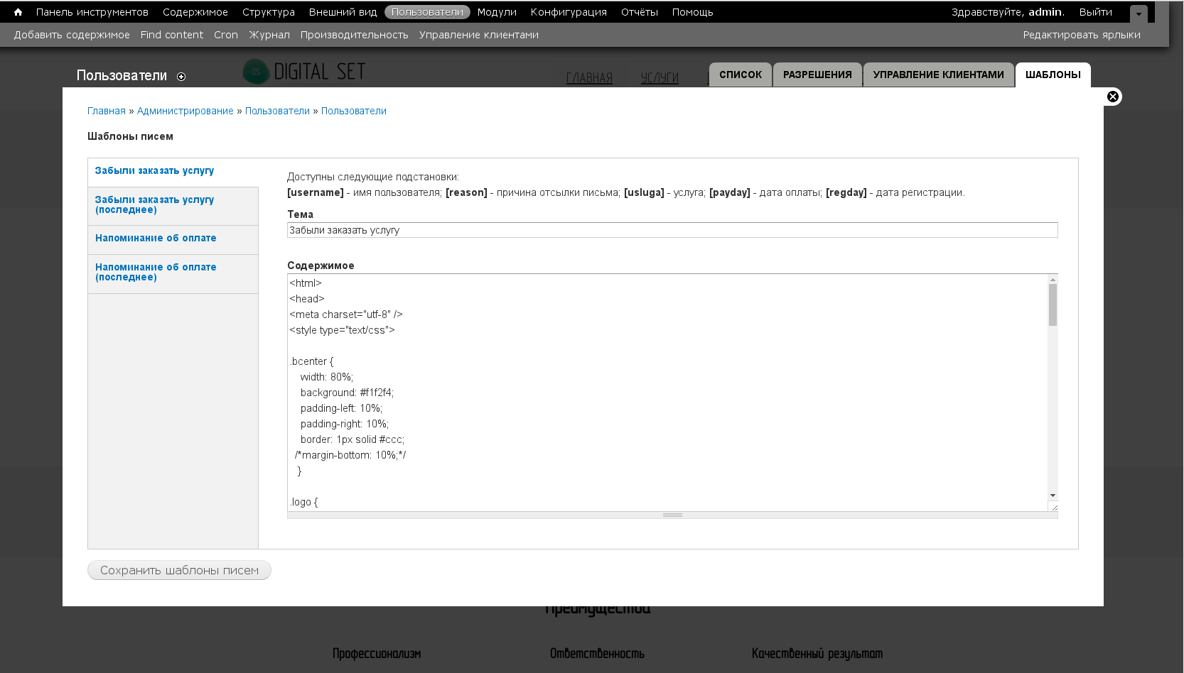 Модуль оповещает клиентов об необходимости оплатить услуги или выбрать одну из услуг студии. Письма отсылаются в виде HTML. Модуль позволяет задать несколько HTML шаблонов для различных случаев взаимодействия с пользователями.