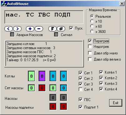 Служит для автоматического управления котельной, в которой используется не один большой котёл, а несколько малой мощности. Мощность дозируется количеством включённых котлов. Включение и выключение котлов производится с учётом наработки для равномерного износа котлов. Кроме того блок управляет сетевыми и подпиточными насосами в зависимости от внешних датчиков. Проект реализован в виде двух частей: исходники для микроконтроллера ATMega128 и приложение для Windows. Симулятор под Windows использует те же исходники для логики работы, что и в прошивке контроллера. В этом приложении эмулируется индикатор, кнопки и светодиоды, которые есть на реальном устройстве. Для исследования поведения системы в течении длительного времени симулятор имеет возможность ускорять процессы относительно реального времени.